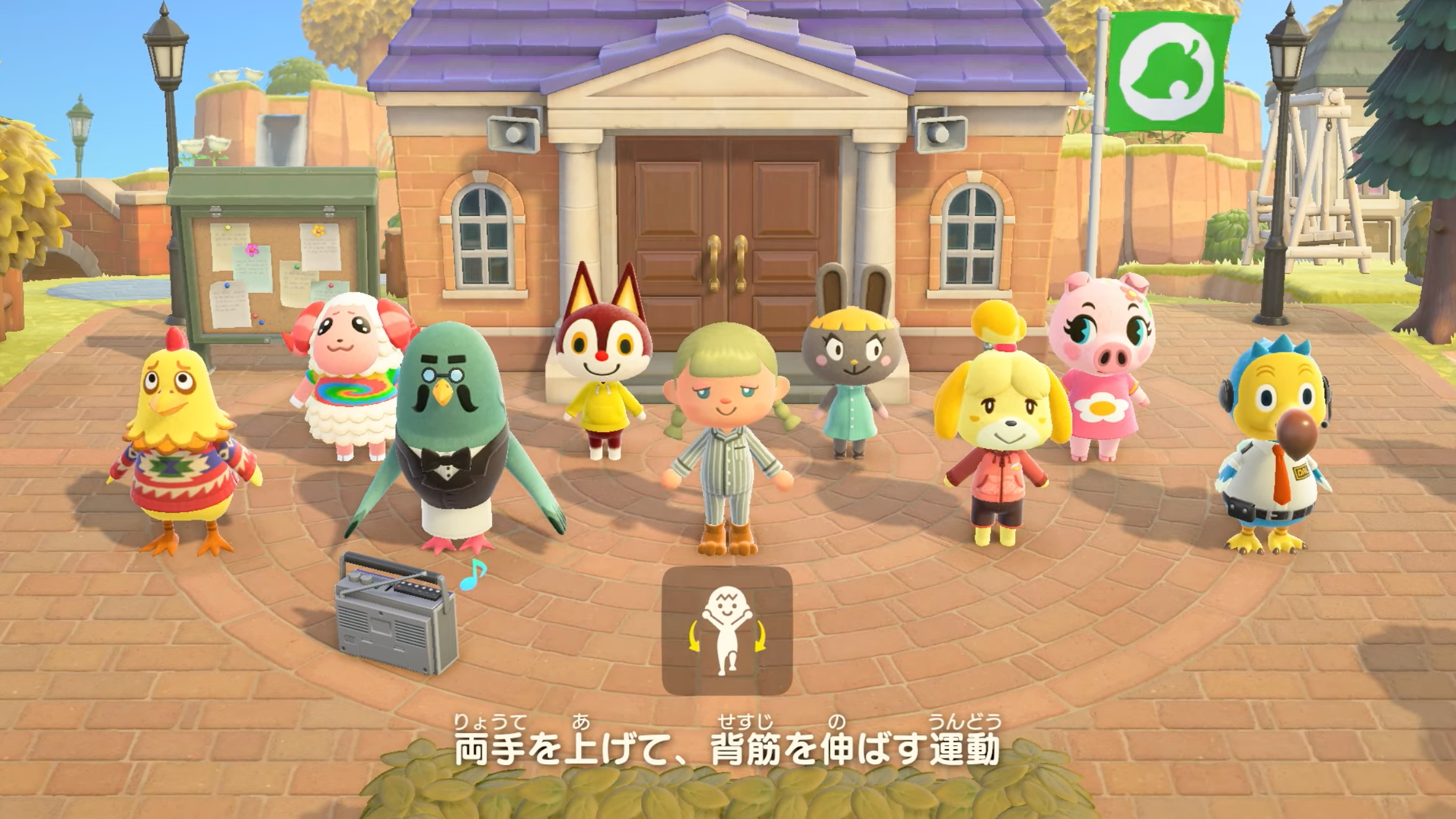 광장에 라디오체조를 하는 라디오카세트가 놓여있어서 주민들과 다같이 체조를 합니다